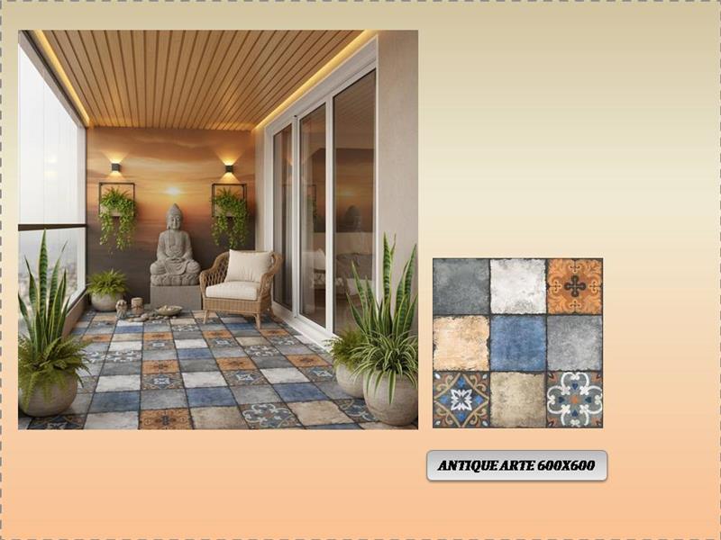The "Antique Arte 600x600" tile is a durable vitrified or porcelain tile designed for both floor and wall applications. It features an antique or Moroccan-inspired aesthetic, often with a non-slip, carving matte finish that provides a soft, non-reflective surface. These tiles are resistant to moisture, stains, and wear, making them a practical and low-maintenance choice for areas like bathrooms, kitchens, and living rooms. With intentional random design variations, each installation offers a unique, artisan touch that blends well with both modern and classic interiors.