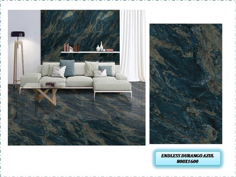 The Endless Durango Azul is a large-format slab tile, known for its elegant appearance and durable finish. It is part of the "Large Slab Tiles" collection, with dimensions of 800x1600mm.The tile features a high-gloss finish, providing a sleek and polished look.The design often mimics the look of natural marble with blue tones, ideal for creating a luxurious feel in any space.Due to its size and finish, it is suitable for various applications, including walls and floors in modern interiors.
