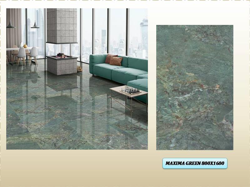 MAXIMA GREEN 800X1600 is a large-format porcelain or vitrified slab tile produced by manufacturers such as Monolith Surfaces LLP.This product features a vibrant green color and a high-gloss finish, designed to provide a sleek, luxurious appearance. The dimensions of the tile are 800mm by 1600mm, ideal for minimizing grout lines in expansive indoor areas. It is primarily used for sophisticated interior applications like living areas, kitchens, and bathrooms.